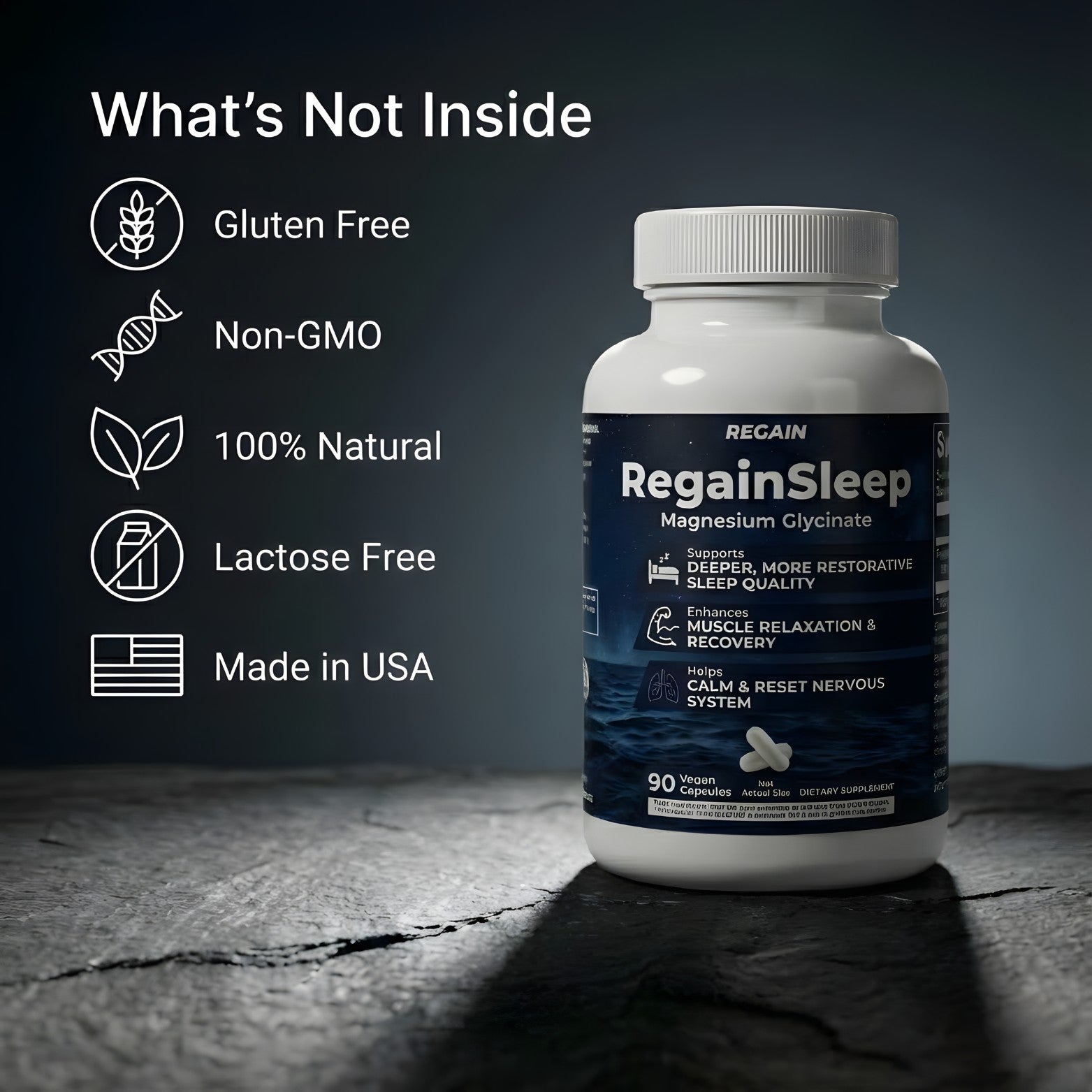 RegainSleep is a magnesium glycinate base designed to support restorative sleep, overnight recovery, and a calmer nervous system.*Instead of knocking you out like most melatonin options, it refuels one of the most important minerals your body uses to relax, repair, and reset. RegainSleep delivers a clean, properly dosed form of magnesium glycinate you can take nightly so the hours you’re already spending in bed work harder for you.